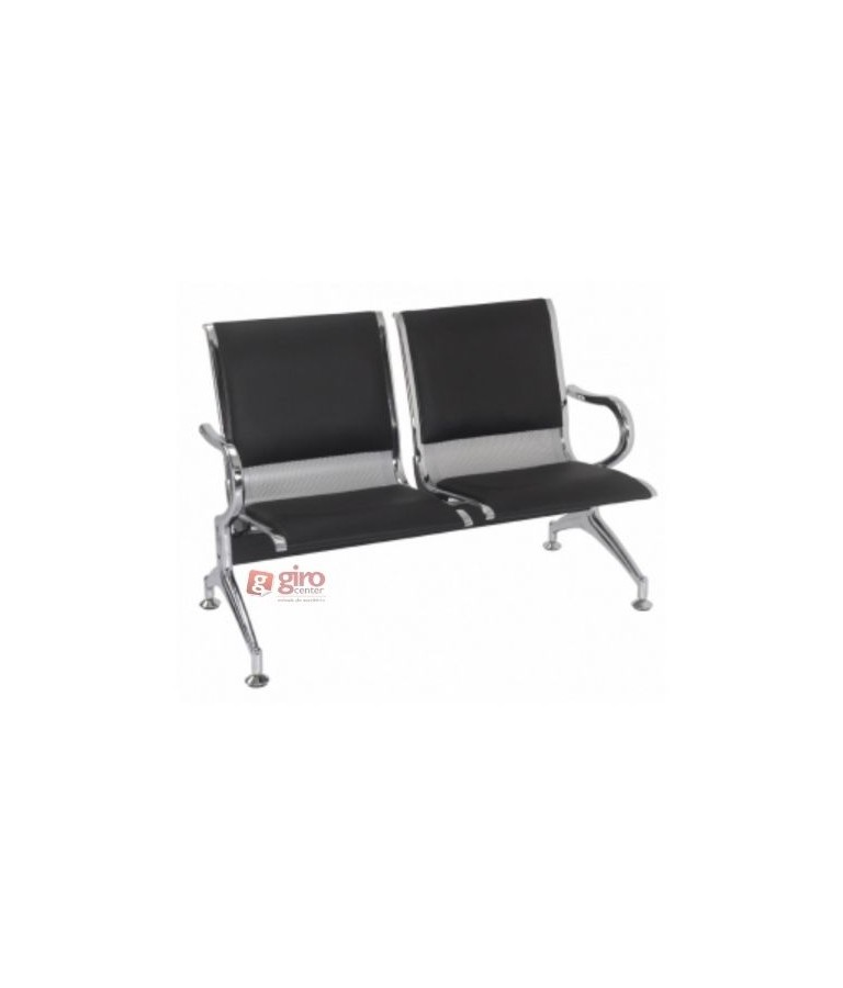 Longarina metálica com 2 lugares, Barra de aço 40 x 80 mm com 1,5 mm de espessura pintura eletrostática na cor preta, apoio de braços anatômico cromado, pés formato de Y cromados com sapatas niveladoras, assento e encosto concha única estruturado em chapa de aço perfurada acabamento em pintura epóxi cor prata brilhante, frisos laterais cromados, estofamento em courino PVC preto.