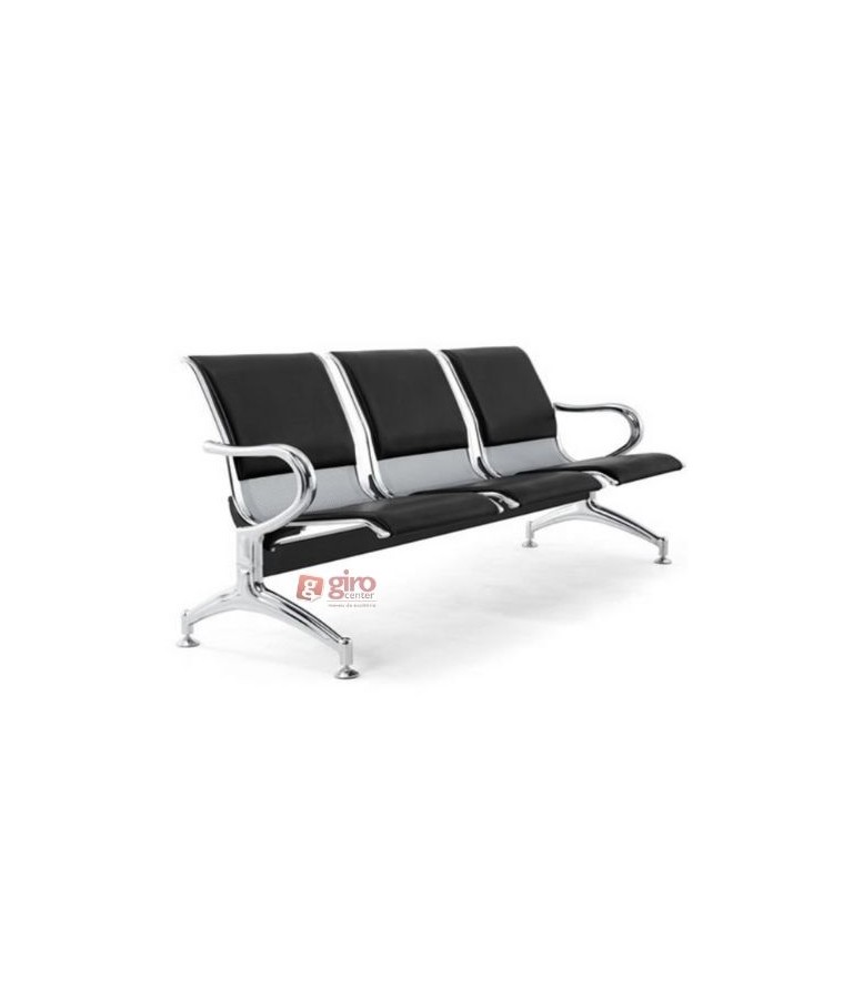 Longarina metálica com 3 lugares, Barra de aço 40 x 80 mm com 1,5 mm de espessura pintura eletrostática na cor preta, apoio de braços anatômico cromado, pés formato de Y cromados com sapatas niveladoras, assento e encosto concha única estruturado em chapa de aço perfurada acabamento em pintura epóxi cor prata brilhante, frisos laterais cromados, estofamento em courino PVC preto.