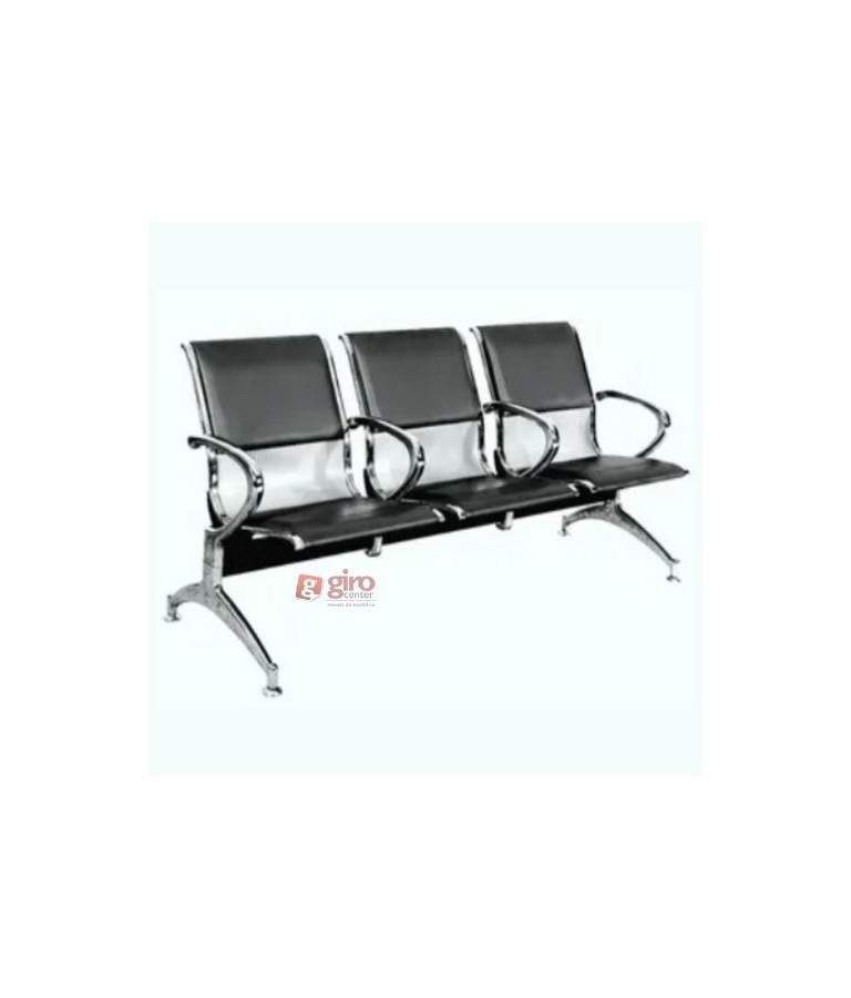 Longarina metálica com 3 lugares, Barra de aço 40 x 80 mm com 1,5 mm de espessura pintura eletrostática na cor preta, apoio de braços anatômico cromado, pés formato de Y cromados com sapatas niveladoras, assento e encosto concha única estruturado em chapa de aço perfurada acabamento em pintura epóxi cor prata brilhante, frisos laterais cromados, estofamento em courino PVC preto.